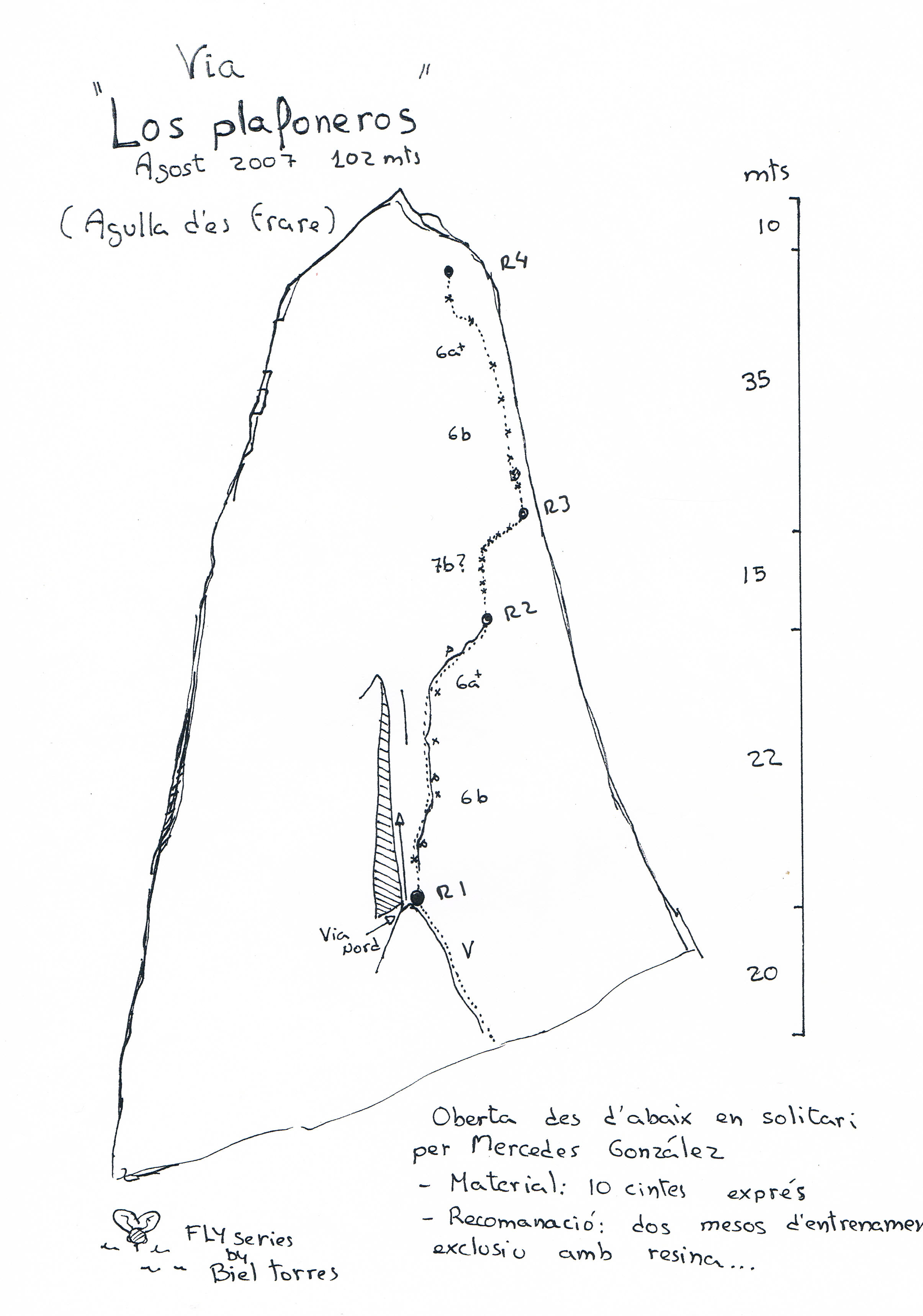 L1/V (20mts), L2/6b (22mts), L3/7b??/A0 (15mts), L4/6b (35mts), 10mts hasta la cima.