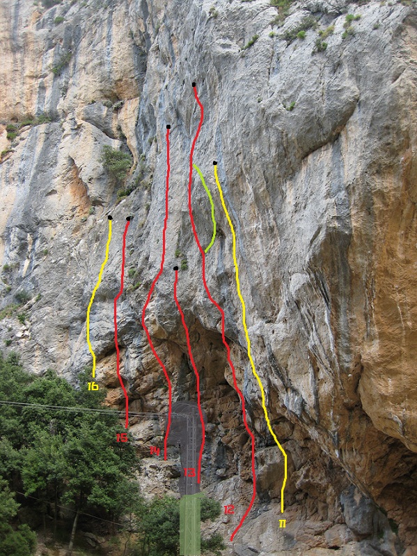 Trazado con un poco de todo. Sección facil abajo(6b+), reposo sin manos, techito de cantos, sección dura en placa desplomada, reposo, paso y bonita placa final. Total unos 30 metros. Hasta la primera argolla 7c duro, hay quien opina que hasta arriba sea 7c+ suave. Existe una variante pasada la argolla(en verde claro en el croquis) grado: 7c+?. CUIDADO con el cable de ALTA TENSIÓN al desmontar la via. NO HAY QUE DESMOSQUETONEARSE DE LA CUERDA!.